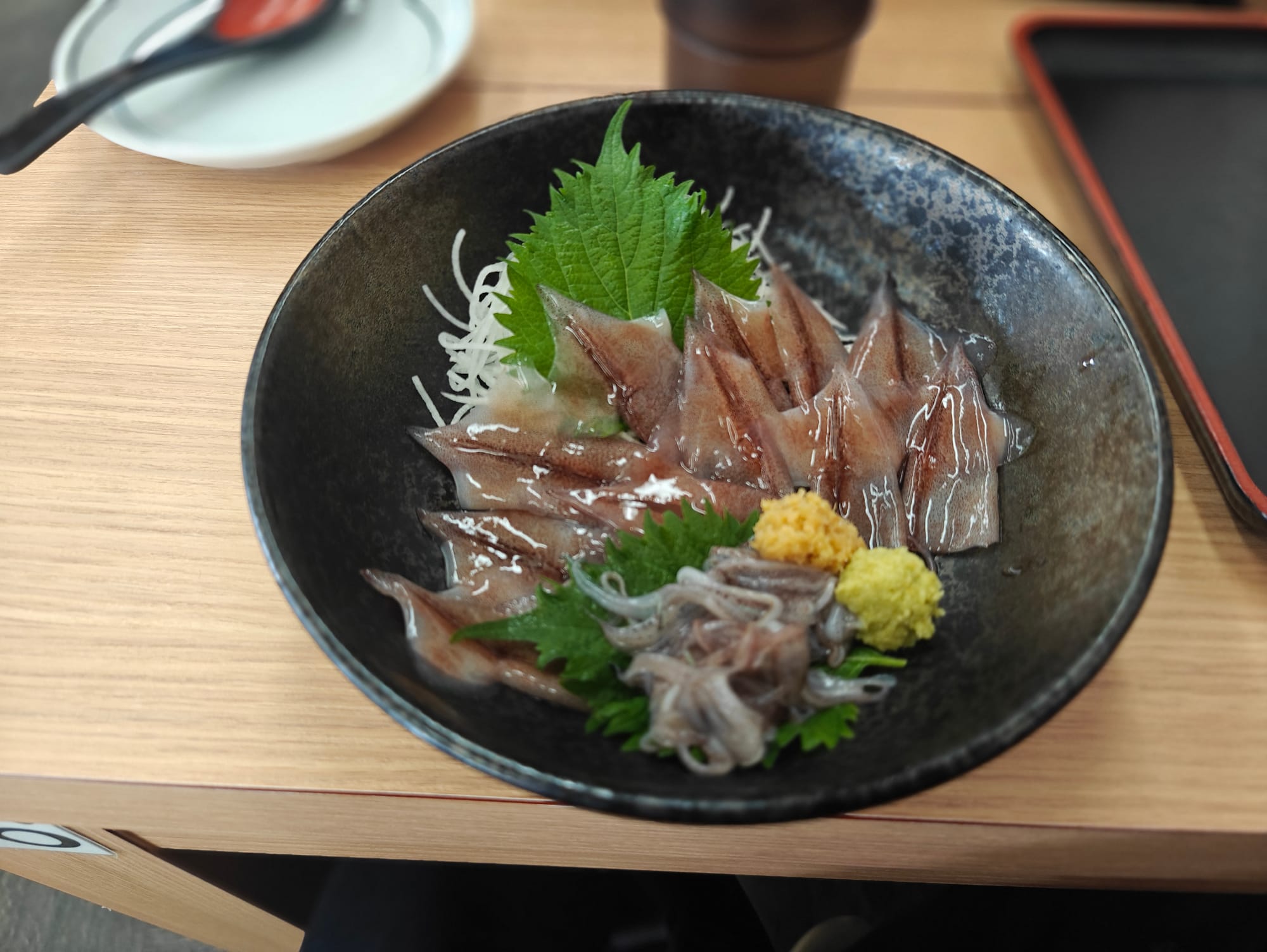 At Himi we ate at a restaurant in the fish market (which is not the touristy type with lots of shops like Omicho, it's like a bare port, the restaurant is the only place you can eat there). Had a seafood don with seafood soup and the famed firefly squid (hotaru ika), which was frankly so so - not much taste and they had some bone or shell in the middle which had to be removed.