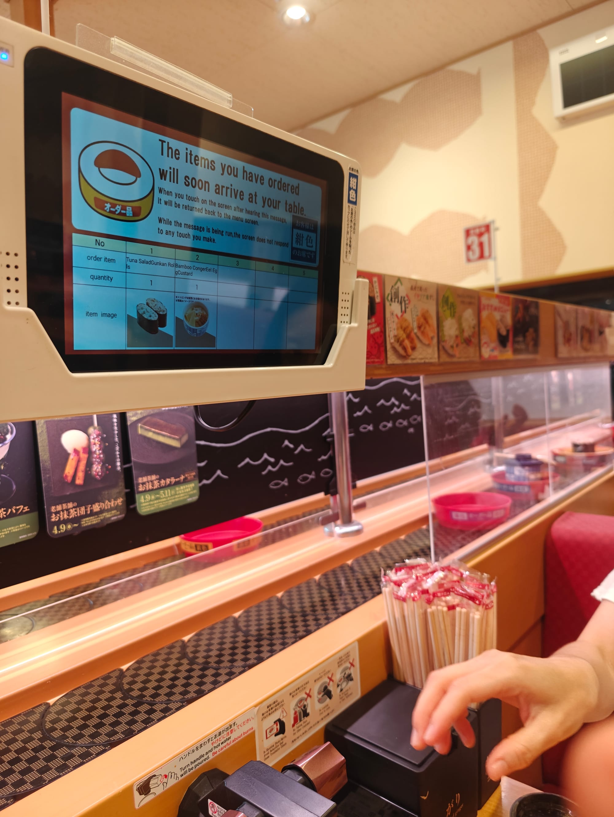 Sushiro: the sushi is fresher and cheaper, but they are also more efficient (after taking a queue number from the machine the screen tells you which table to go to). The sushi you order arrives on the conveyor belt without stopping so you have to be alert to take it before it leaves!